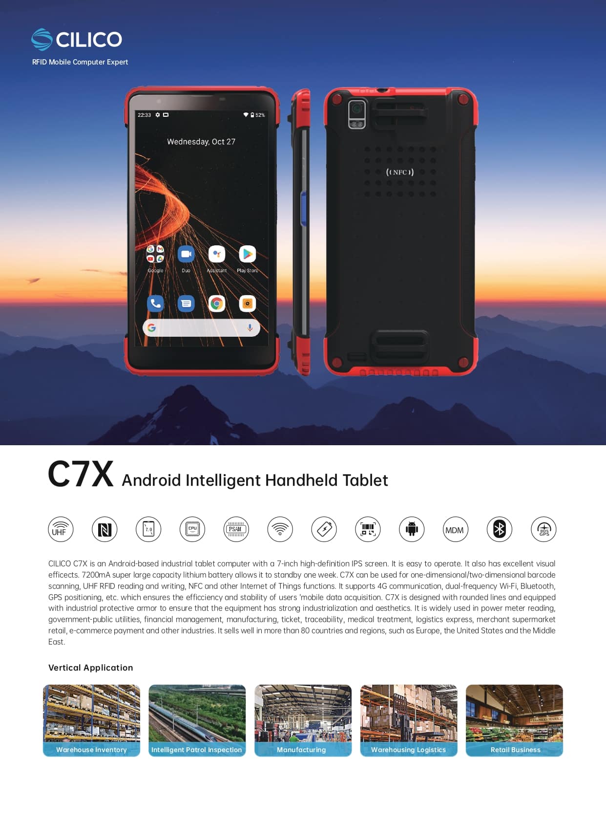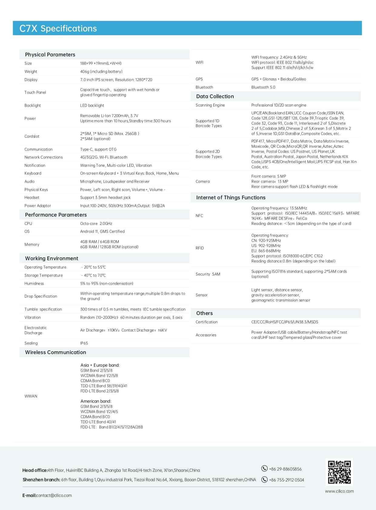 C7X, 1D/2D barkod tarama, UHF RFID okuma ve yazma, NFC ve diğer Nesnelerin İnterneti fonksiyonlarını tek bir cihazda birleştirir. 4G iletişim, çift frekanslı Wi-Fi, Bluetooth ve GPS konumlandırma özellikleri ile kullanıcıların mobil veri toplama verimliliğini ve istikrarını sağlar.
