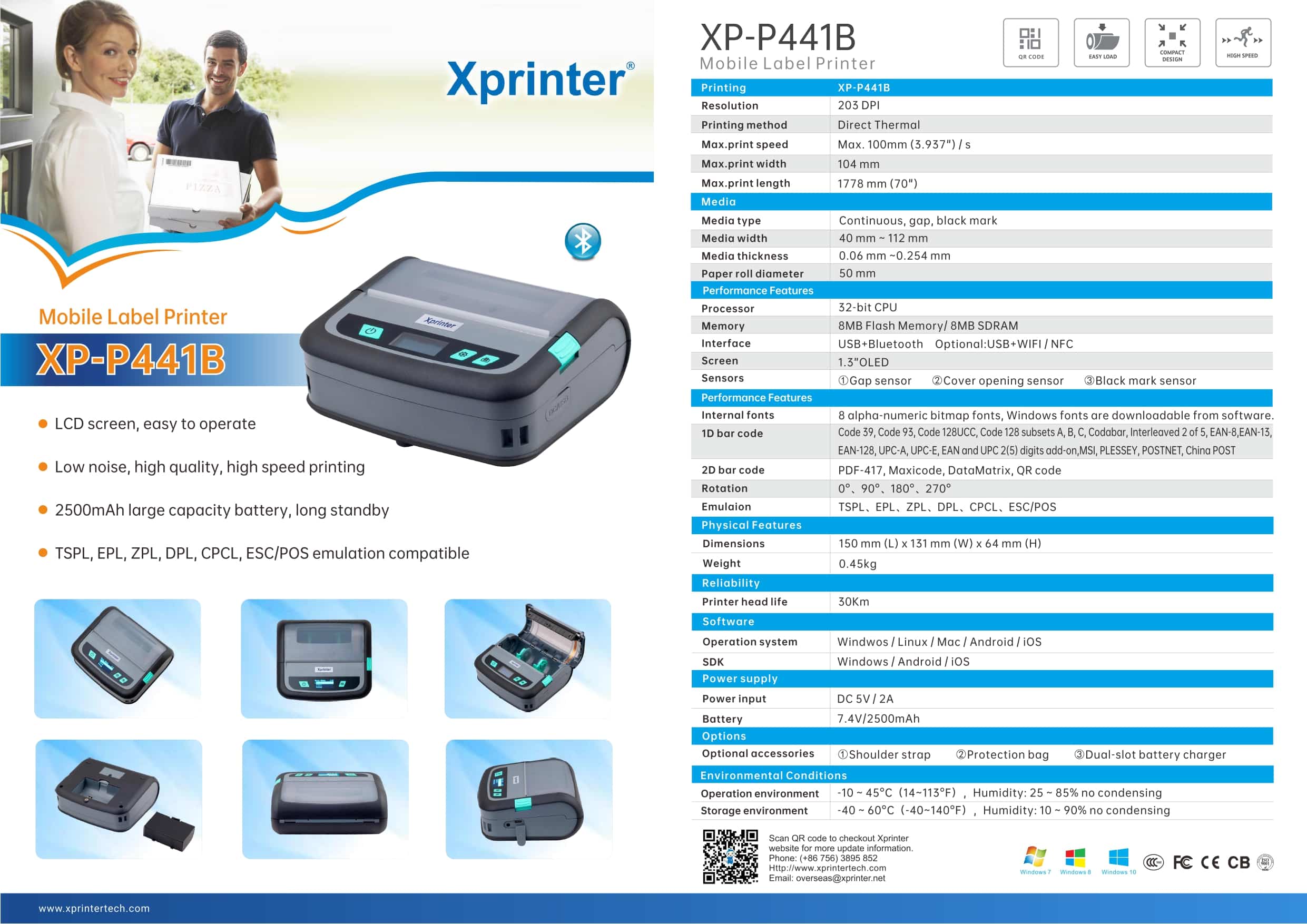 XP-P441B, TSPL, EPL, ZPL, DPL, CPCL, ESC/POS emülasyon desteği ile çok yönlü kullanım sunar. Hafif ve dayanıklı yapısıyla çeşitli sektörlerde mobil etiketleme ihtiyaçlarına pratik bir çözüm sağlar.