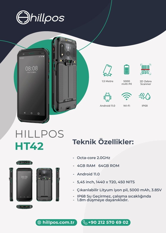Zorlu koşullar altında dahi yüksek performans sergileyen HILLPOS HT42, mobil çözüm ihtiyaçlarına kapsamlı bir yanıt sunuyor. Güçlü donanım özellikleri ve dayanıklı tasarımıyla ön plana çıkan bu akıllı el terminali, çeşitli endüstriler için ideal bir iş ortağı niteliği taşıyor.