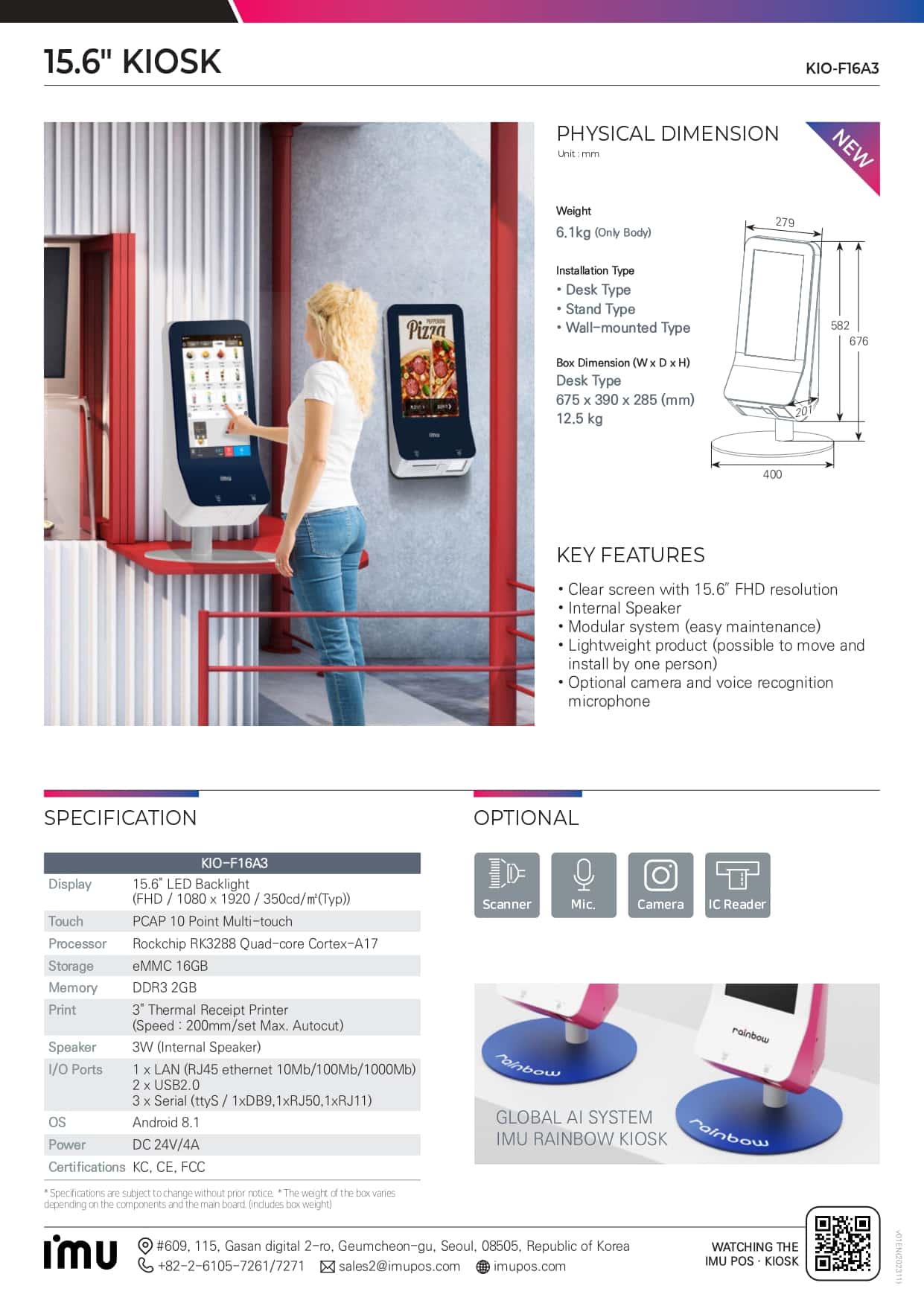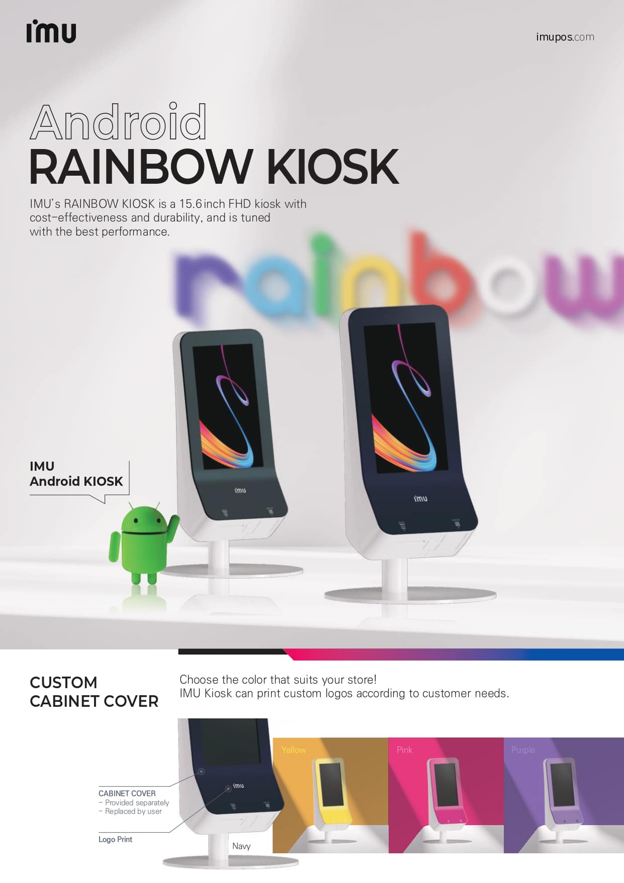 IMU RAINBOW Kiosk, estetik görünümü ve kullanım kolaylığıyla dikkat çeken 15.6 inç Android tabanlı bir dijital kiosk çözümüdür. Mağaza ve işletmeler için ideal bir ürün sunan RAINBOW Kiosk, beklentileri karşılayan performans ve dayanıklılığa sahip.