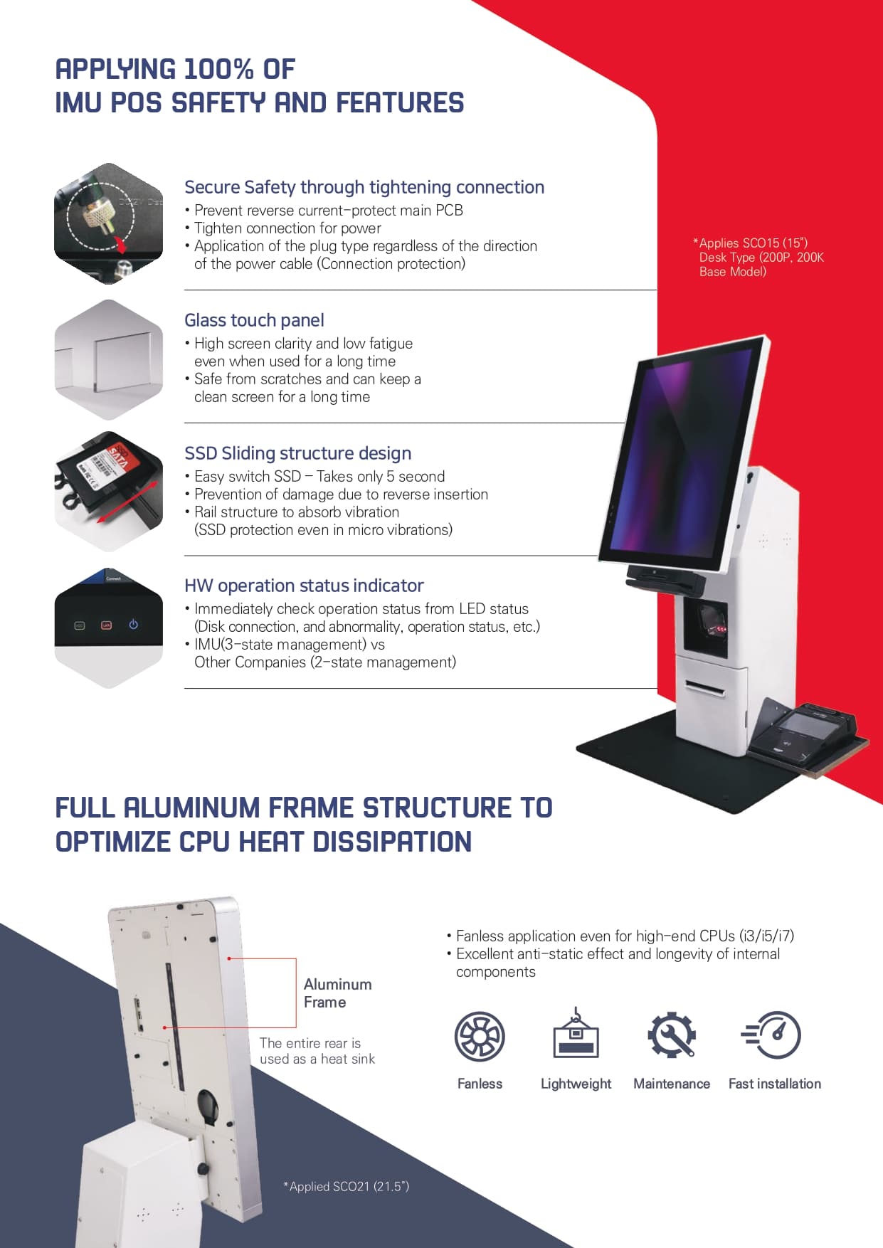SCO, 15 inç veya 21.5 inç boyutlarında kapasitif çok dokunmalı ekran seçenekleriyle sunulur. Masa üstü veya ayaklı tip kurulumlarla mekânınıza kolayca uyum sağlar. Geniş bağlantı seçenekleri (seri port, USB, Ethernet) cihazın esnek kullanımını mümkün kılar.
